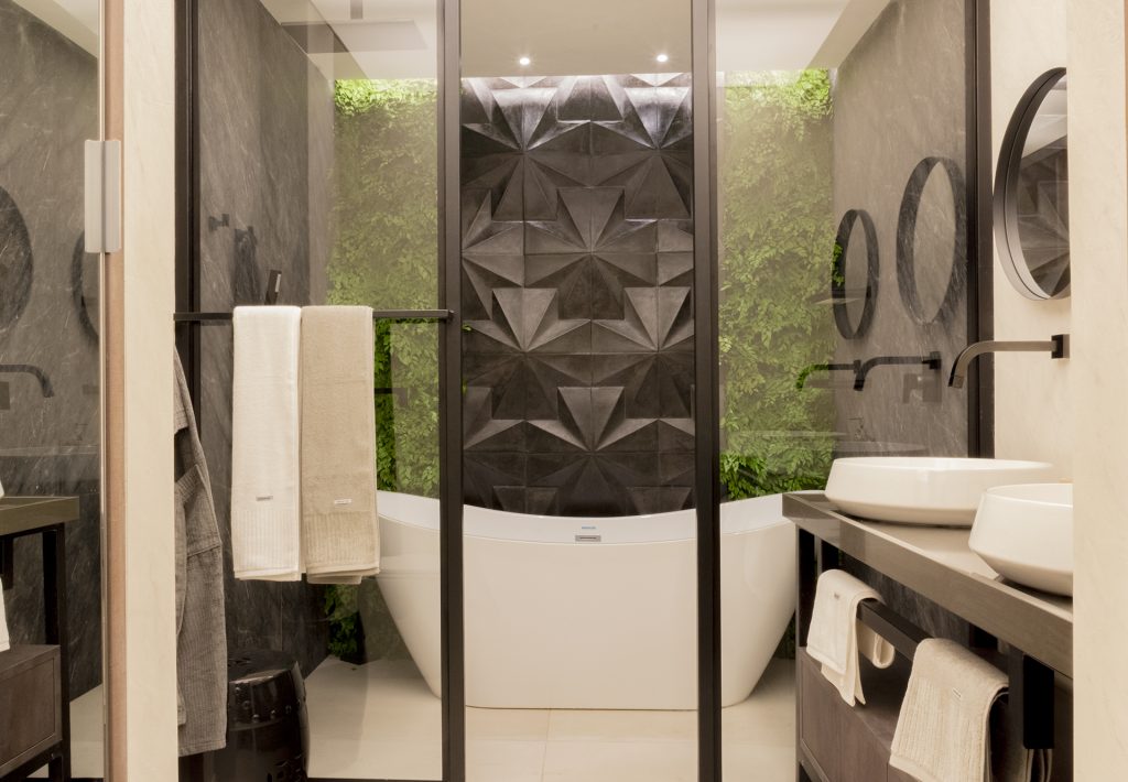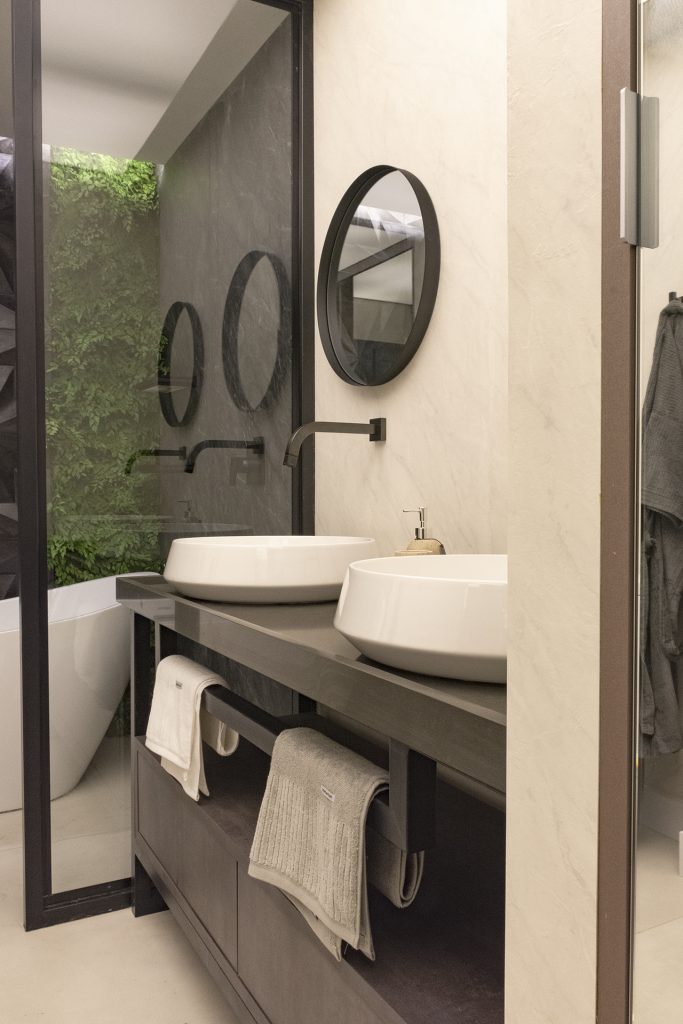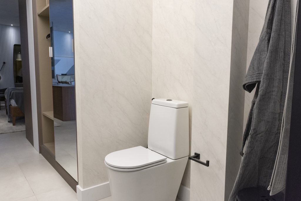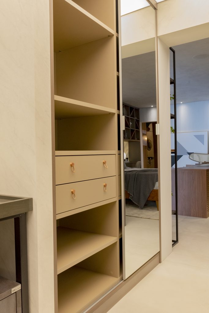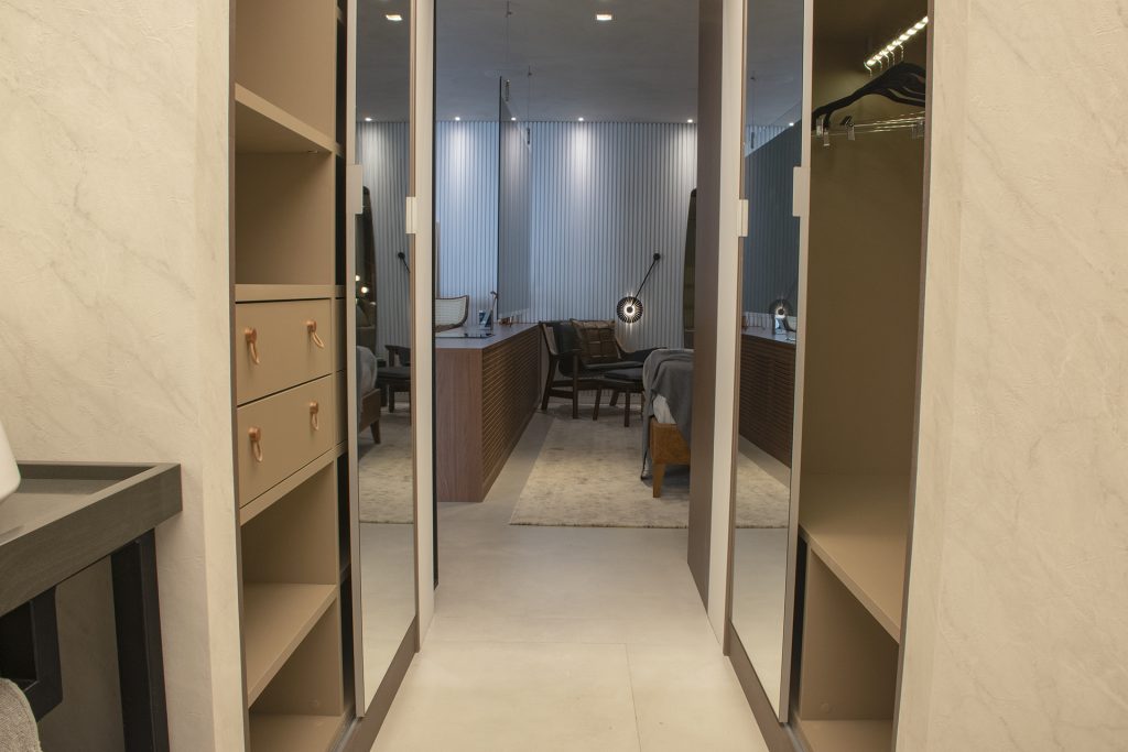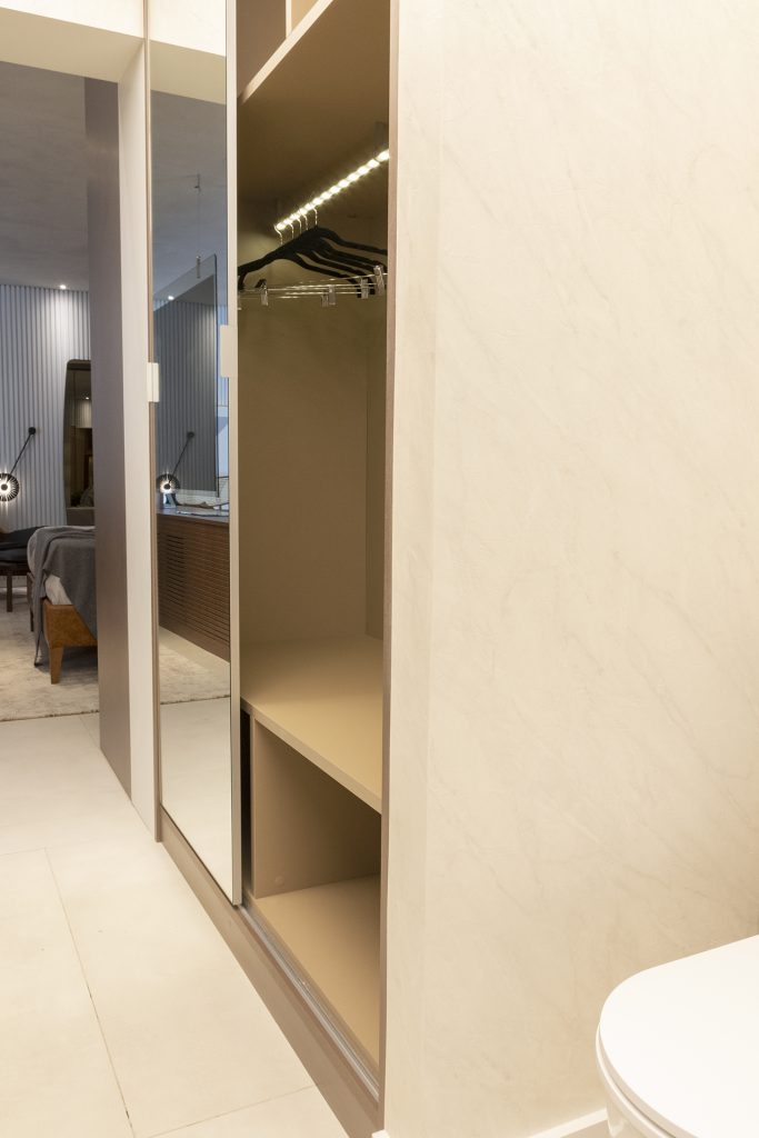 WC e closet expostos no evento Campinas Decor 2019 pela Leo Sob Medida, inspirados num apartamento de 92m² para um casal e com ambientes integrados.