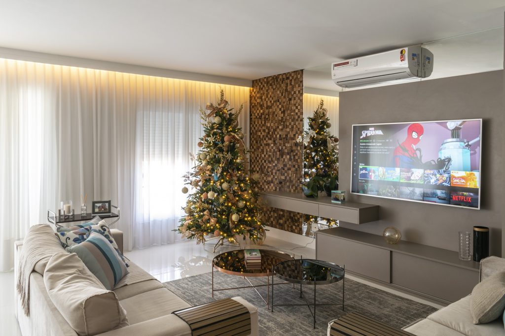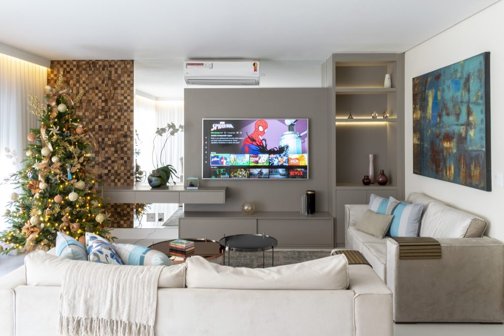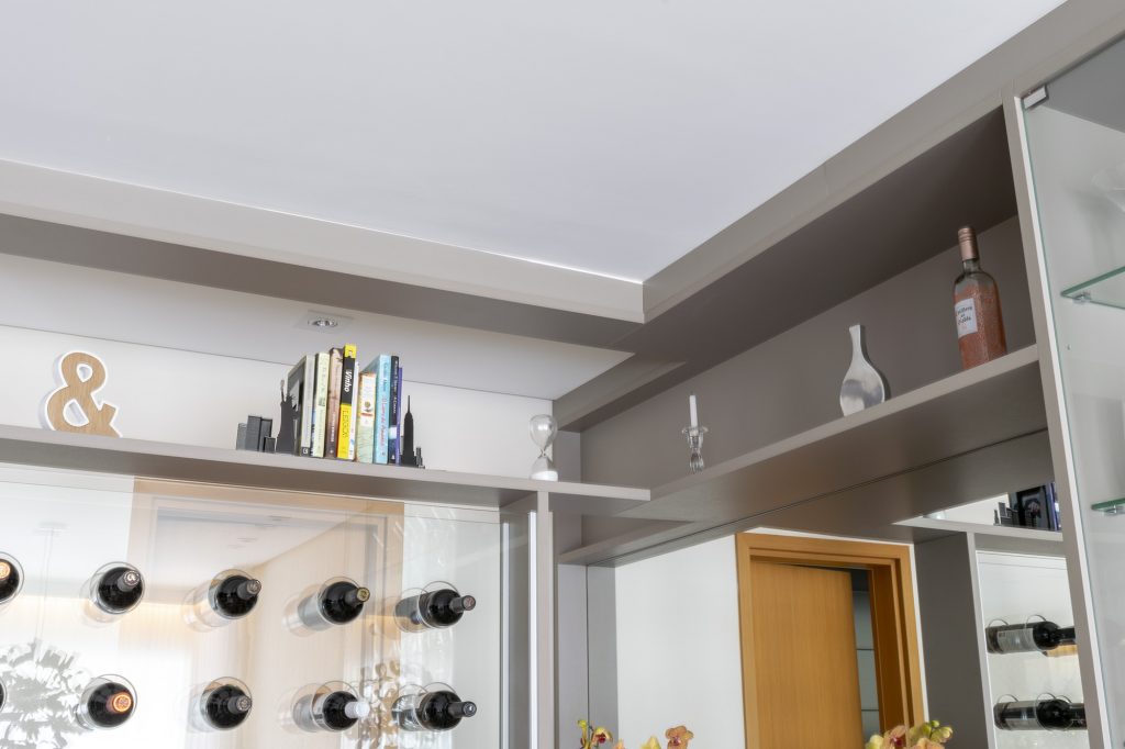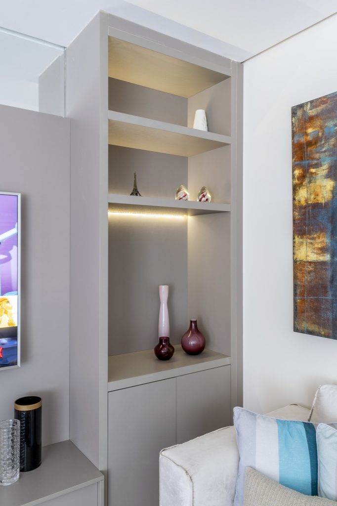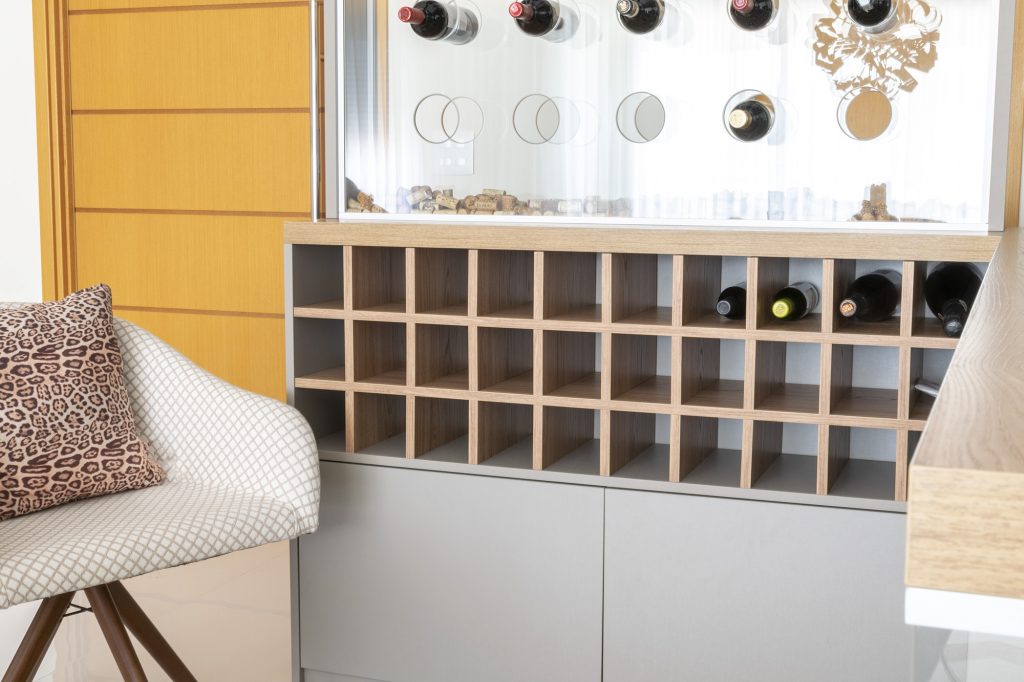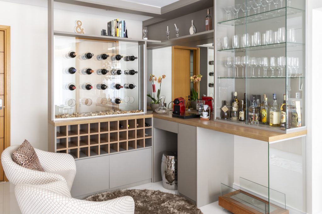 Home para TV com iluminação embutida, prateleiras para objetos decorativos e painel para TV. Cores que trazem harmonia e leveza ao ambiente. Projeto desafiador para adega com porta garrafas e rolhas em vidro, planejado para fazer a divisão dos ambientes com o lavabo e integrar as salas de estar e jantar. Acomoda bebidas e decorações ao gosto dos moradores.